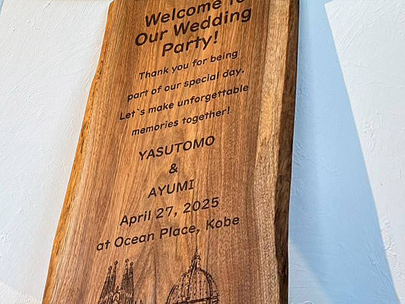 温もりと洗練を刻む、特別なウエディングのためのレーザー彫刻ウェルカムボードをオーダー制作いたしました。 結婚式が終わった後も、ご自宅のインテリアとして永く飾っていただけます。